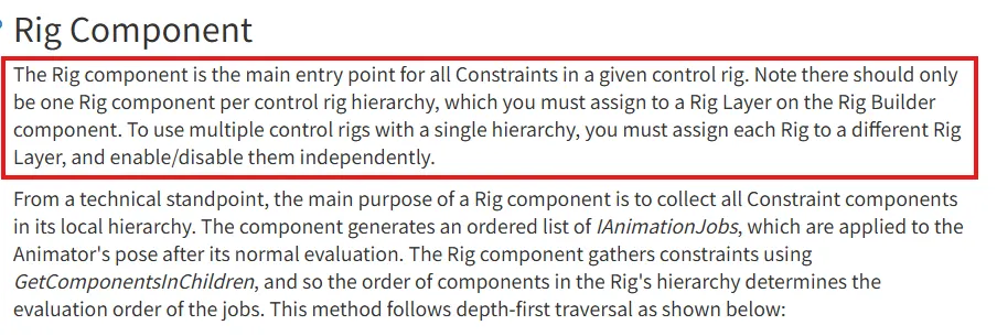 Rig 컴포넌트는 “컨트롤 리그”의 모든 Constraints의 진입점이며, Rig 컴포넌트는 GetComponentsInChildren 메서드를 사용하여 Constraints를 수집하므로, Rig 계층구조에서 컴포넌트의 순서가 작업의 평가 순서를 결정한다.