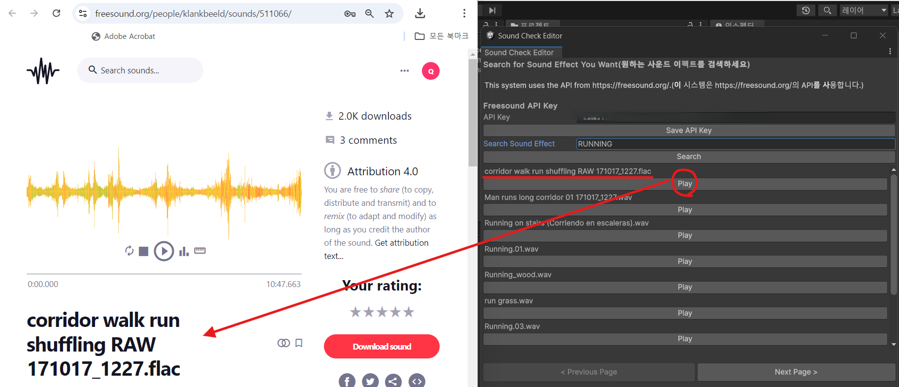 SoundCheckEditorUnity Engine 내에서 필요한 사운드를 즉시 Freesound에서 검색하여 플레이할 수 있는 커스텀에디터Freesound : 저작권 무료 음원사이트. (https://freesound.org/)API 문서는 http://www.freesound.org/docs/api/ 에서 찾을 수 있음.API 키는 https://www.freesound.org/apiv2/apply/ 에서 신청 가능 .GitHub 리포지토리 링크https://github.com/shin0624/SoundCheckEditor 패키지 다운로드 링크https://assetstore.unity.com/packages/tools/audio/soundcheckeditor-314439 개발 환경Unity Engi..